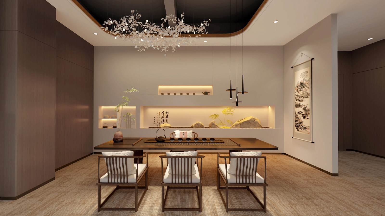 公共區(qū)域借鑒中國山水畫的意境,采用了假山、古樹、原石等造物裝飾,將山水美景移進室內,營造出與自然和諧共生的氛圍.為進入展廳做出了鋪墊。