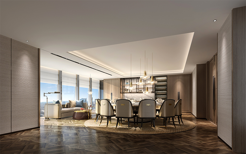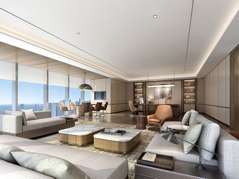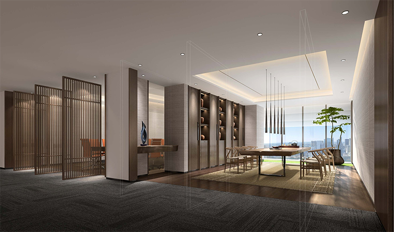 本方案的設(shè)計(jì)強(qiáng)調(diào)傳統(tǒng)文化與現(xiàn)代審美的結(jié)合,既保留中式的典雅與韻味,又融入現(xiàn)代設(shè)計(jì)的簡(jiǎn)約與時(shí)尚,通過巧妙的布局和隔斷,使用中式屏風(fēng)、工藝隔斷、簡(jiǎn)約博古架等,增強(qiáng)空間的層次感和流動(dòng)性,使空間更加靈動(dòng)通透。且多種形式的接待空間,滿足不同形式的商務(wù)接待場(chǎng)景。