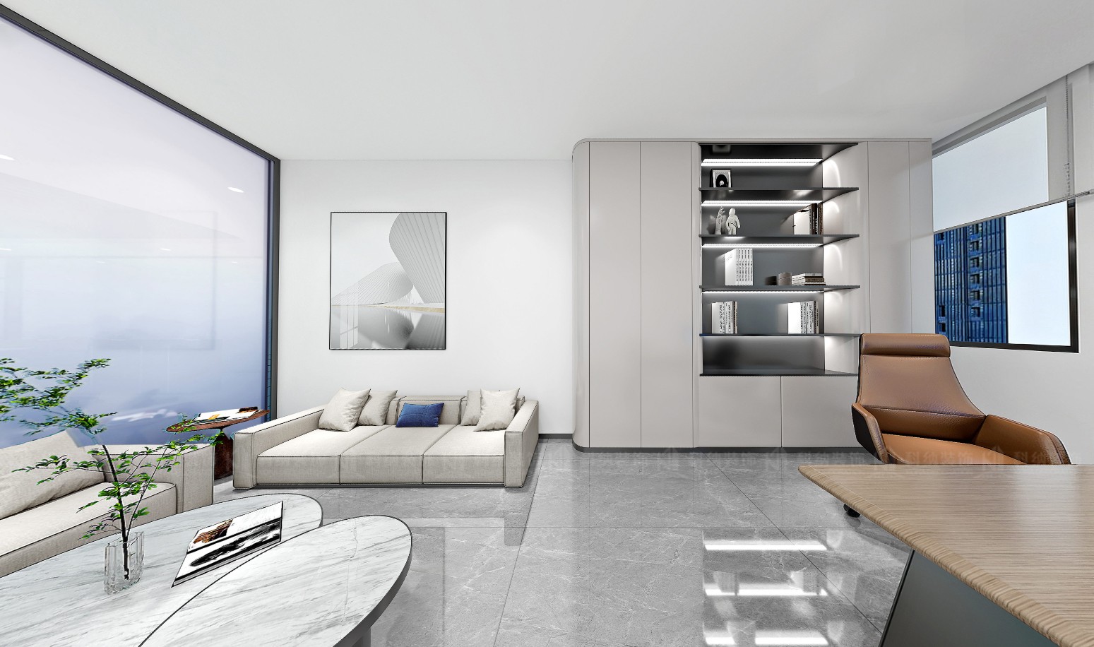 設(shè)計(jì)理念:本方案采用極簡(jiǎn)的設(shè)計(jì)手法,融合科技元素,選用現(xiàn)代新型材料和中性色調(diào),搭配動(dòng)態(tài)照明,營(yíng)造出專業(yè)活力的辦公氛圍。通透的玻璃墻設(shè)計(jì),冷色調(diào)主調(diào)搭配流暢的天花板線條,再加上獨(dú)特的燈光設(shè)計(jì),營(yíng)造出滿滿的未來感。整體的辦公空間強(qiáng)調(diào)開放性、靈活性體更彰顯出了企業(yè)的創(chuàng)新形象。