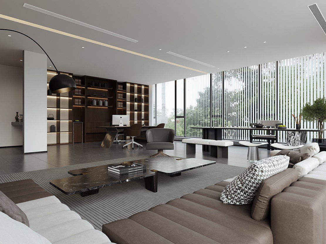 設(shè)計理念:整體空間以白色和灰色為主色調(diào),采用開放式的辦公布局,搭配金屬質(zhì)感的辦公家具和玻璃隔斷,營造出簡潔、現(xiàn)代的科技氛圍。在休息區(qū),設(shè)置了舒適的皮質(zhì)沙發(fā)和精致的茶幾,搭配暖黃色的燈光,為員工提供了一個放松身心的場所。同時,在辦公室的各個角落擺放了一些藝術(shù)雕塑和綠植,提升了空間的文化品質(zhì)和自然氣息。