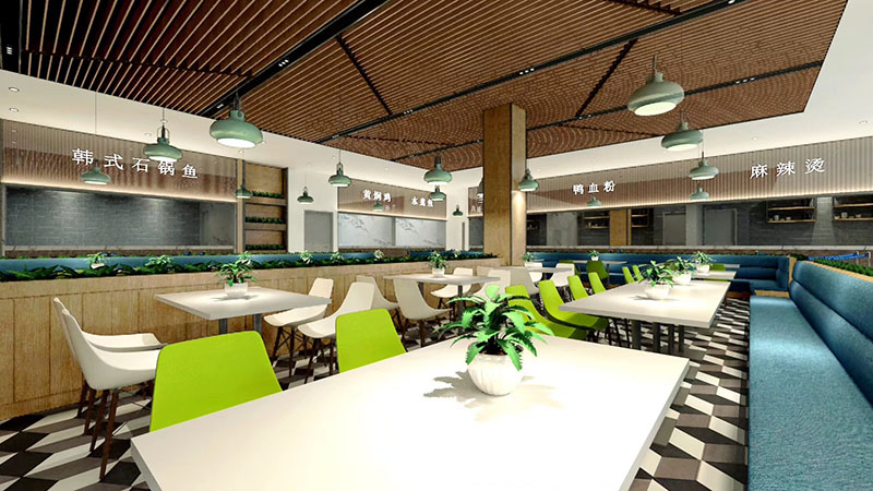 設計理念:將飲食文化與現(xiàn)代快餐空間設計相結合,打造富有內(nèi)涵的互動式空間。充分體現(xiàn)空間尺度,優(yōu)化食堂環(huán)境品質(zhì),營造健康、安全、舒適的就餐環(huán)境。