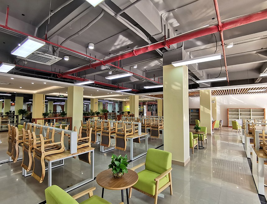 設(shè)計(jì)理念:此次項(xiàng)目是廣東學(xué)院南城校區(qū)圖書館閱覽室裝修工程。整個(gè)圖書館閱讀空間主色調(diào)定為白色、木色、淡綠色,還原清新自然的氛圍,喚醒青春歲月與校園生活氣息。