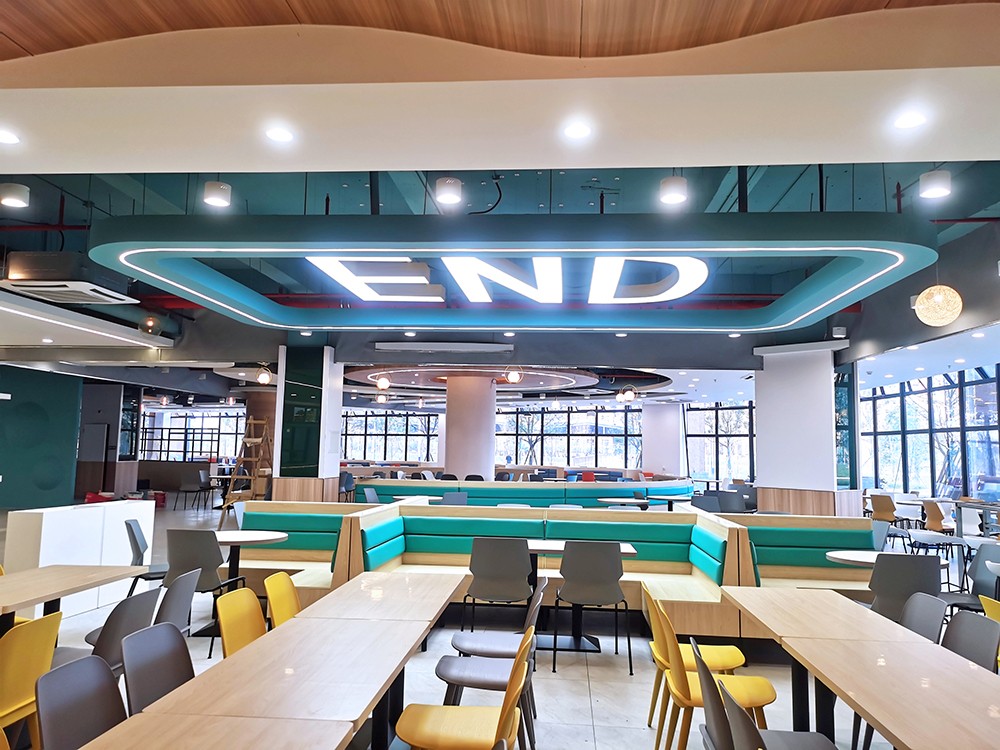 設(shè)計(jì)理念:空間設(shè)計(jì)力在突破傳統(tǒng)食堂形式,表達(dá)校園食堂快樂(lè)食間品牌意識(shí),傳遞快樂(lè)食間價(jià)值觀。為學(xué)生和老師提供有品位的就餐環(huán)境,享受美食之外還具有學(xué)習(xí)、聚會(huì)、獨(dú)處的空間功能。整體空間在以白色為主基調(diào)的設(shè)計(jì)中,將天花裝飾藍(lán)色,柱子選用了一點(diǎn)墨綠色進(jìn)行點(diǎn)綴,以注入環(huán)保、科技、自然等元素,呈現(xiàn)出美感與實(shí)用兼?zhèn)涞膭?chuàng)新設(shè)計(jì)。木質(zhì)桌椅溫潤(rùn)自然,大盆綠植規(guī)律擺放,搭配錯(cuò)落有致,整個(gè)空間自然開(kāi)闊。