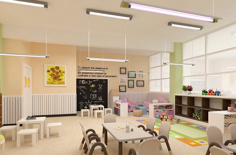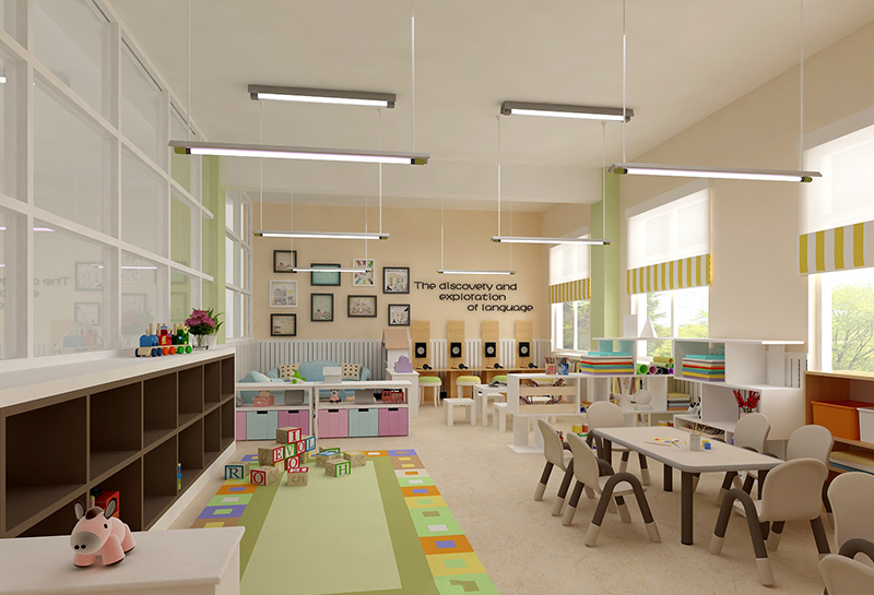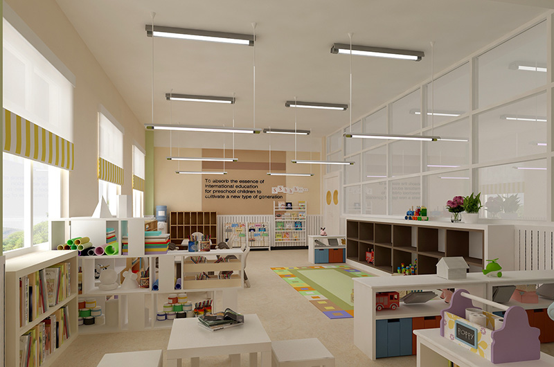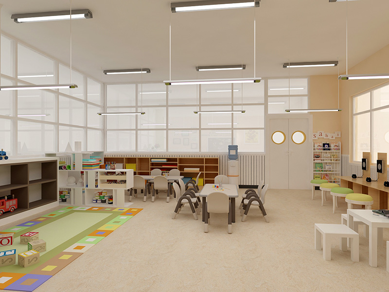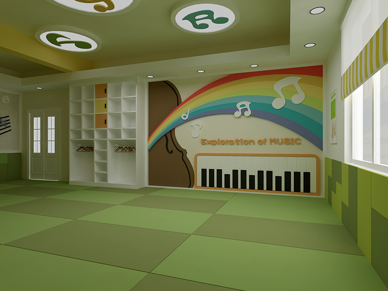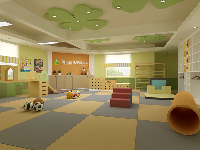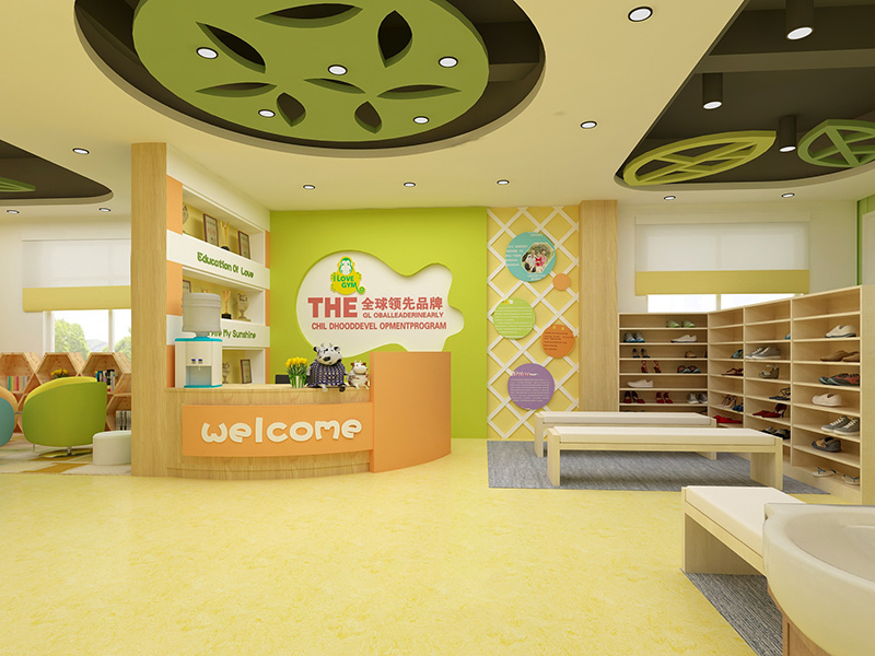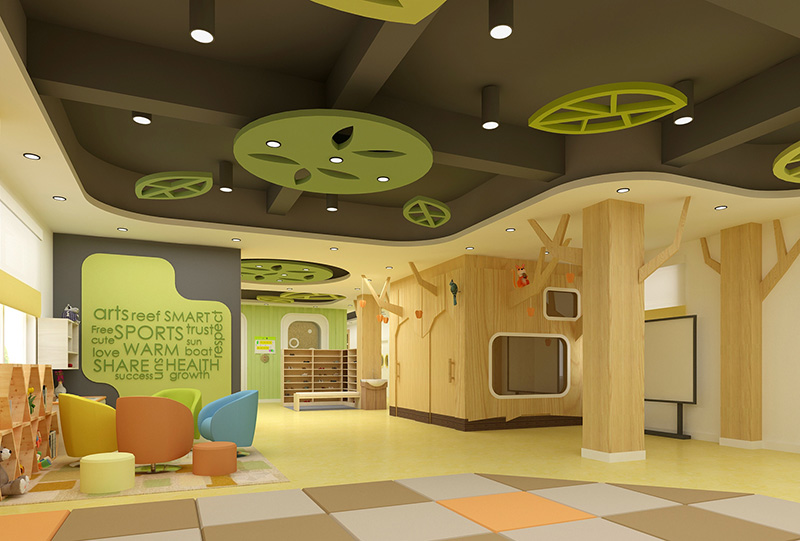 設計理念:本幼兒園設計案例基于兒童的心理及生理特點,設計師利用了顏色來表達情感。以淺橙色,蘋果綠作為主題色,分別代表了可愛柔和的親切感,活力明快的健康成長,清爽積極的探索思考。再加入了原木色的家具及柜體,使得整個空間在光線的映襯下顯得柔和,自然。大面積使用了原木墻板及原木假梁,這種秩序和結構的關系對幼小的孩子充滿了啟發(fā)性。